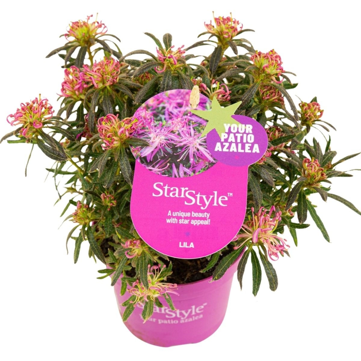 De Azalea StarStyle is beschikbaar in vier uitvoeringen: Lila met opvallende paars-lila bloemen, Pink met een zachte roze gloed, White voor een elegante lichte uitstraling en de Mix met lila, roze en wit door elkaar voor maximale vrolijkheid. Alle varianten bloeien uitbundig in het voorjaar en blijven daarna het hele jaar groen als structuurplant.