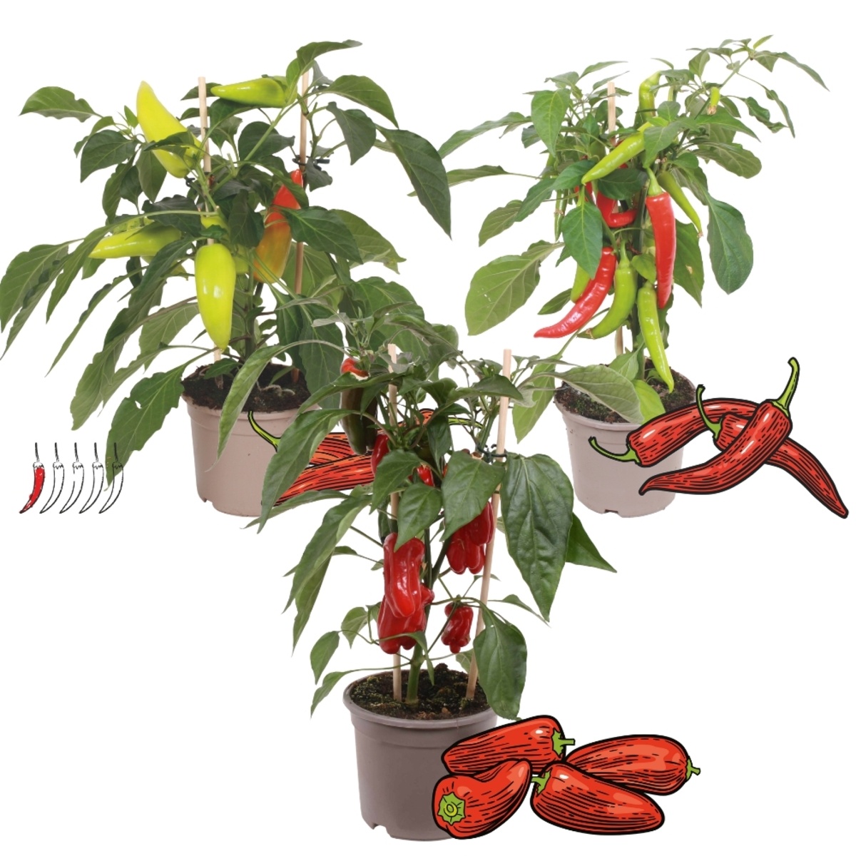 Met het Pittig Trio brengt u variatie in uw eigen oogst. De set bevat PICK-&-JOY® Hot Chili Red voor een vurige pit, Mild Chili voor wie het iets rustiger aan houdt, en de Snack Pepper Red als knapperige tussendoor. Alle drie gedijen ze prima in een pot op een zonnige plek, ideaal voor wie weinig ruimte heeft maar toch zelf groenten wil kweken.