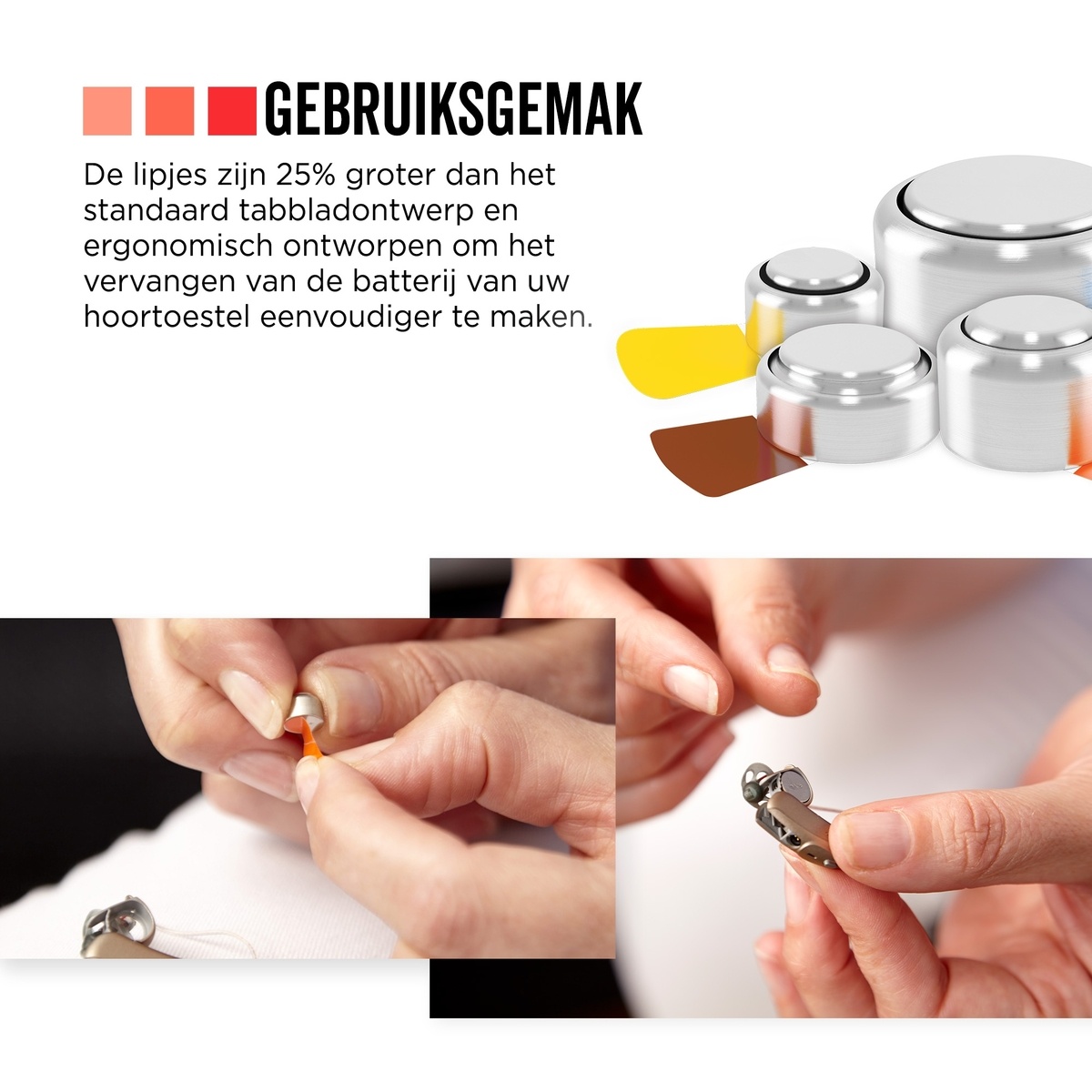 De lipjes zijn 25% groter dan het standaard tabbladontwerp en ergonomisch ontworpen om het vervangen van de batterij van uw hoortoestel eenvoudiger te maken.